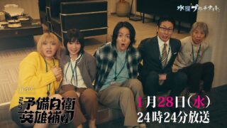 ドラマ 【予告】こちら予備自衛英雄補?! 1月28日(水)24時24分~[第4話PR公開!] “不幸に憧れる?!万引きヒーロー” 「ナガレさん助けてください!」 会議室では、チュータ(森永悠希)がミズノ(戸次重幸)の尻から噴射された糸で縛られていた!遅れてやってきたナガレ(菊池風磨)とサエ(のん)が事情を聞くとチュータがミ... 2026.01.22 ドラマ